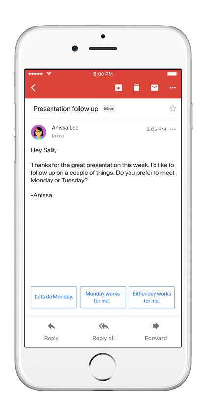 It’s pretty easy to read your emails while you’re on the go, but responding to those emails takes effort. Smart Reply, available in Inbox by Gmail and Allo, saves you time by suggesting quick responses to your messages. The feature already drives 12 percent of replies in Inbox on mobile. And starting today, Smart Reply is coming to Gmail for Android and iOS too.