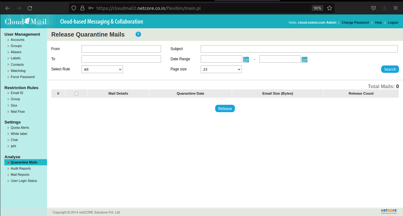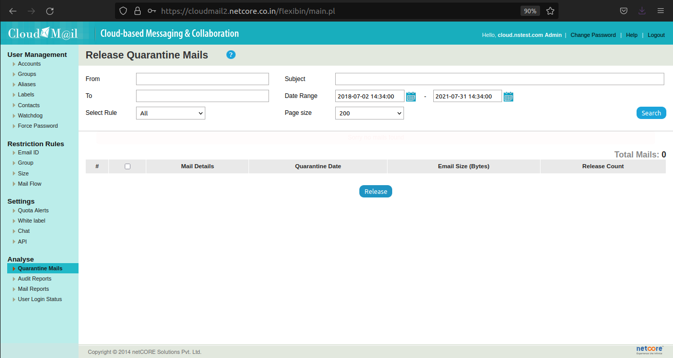 Follow the below steps to release Quarantine emails on Cloudmail panel