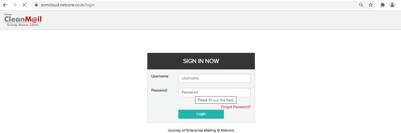 1. Access the ECM admin panel https://ecmcloud.netcore.co.in/ in web browser.