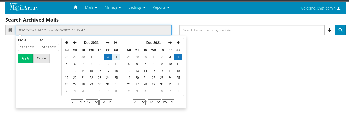 Later select the from & To date to search the mails of user and click on Apply.