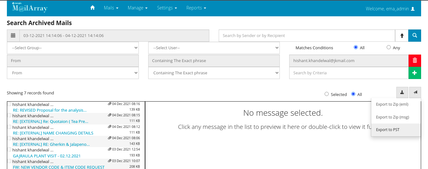 Then click on search icon and after that you will get the selected user mails as below. If you want to download only selected mails then click on Selected. If you want all the mails then click on All to download all the mails.