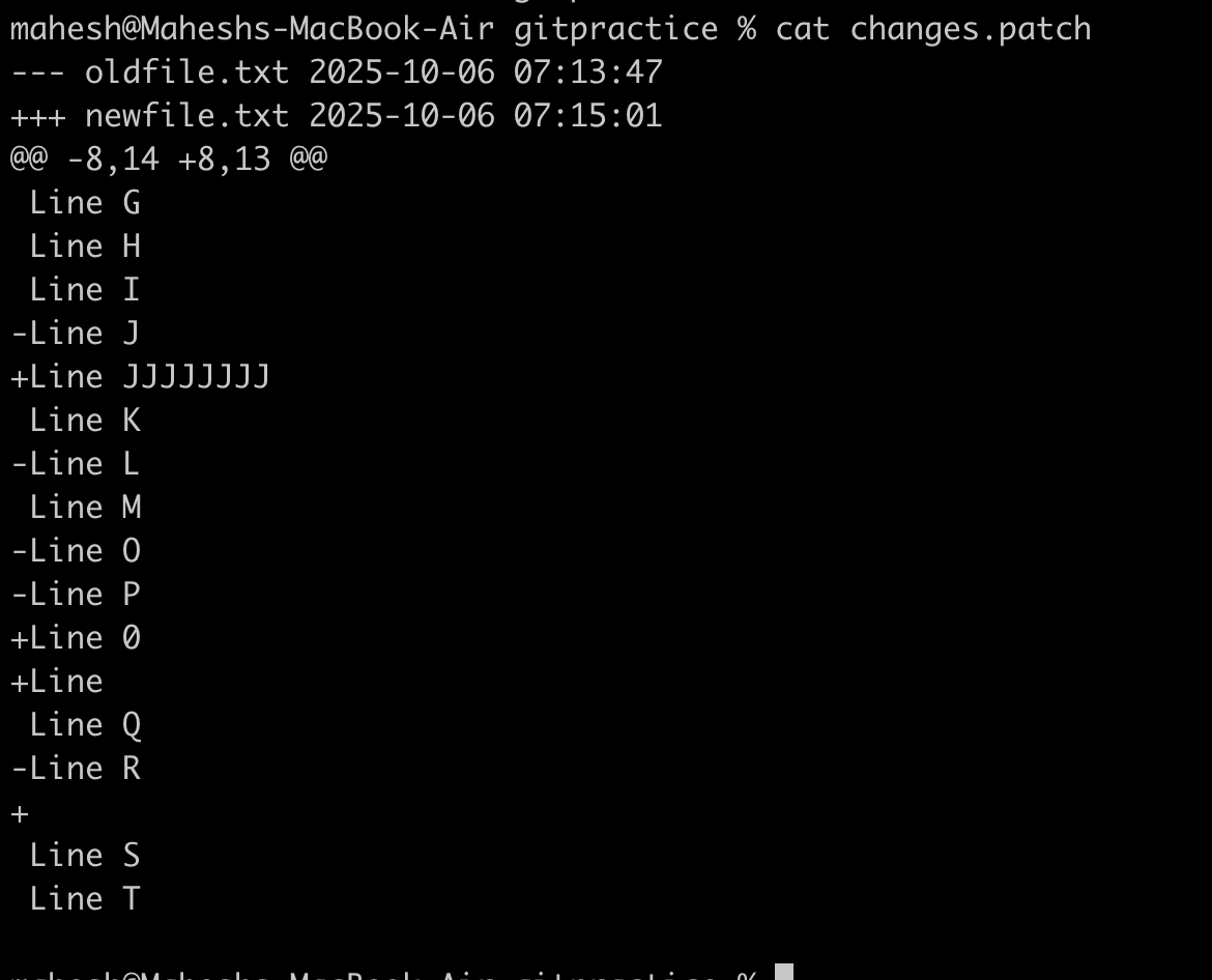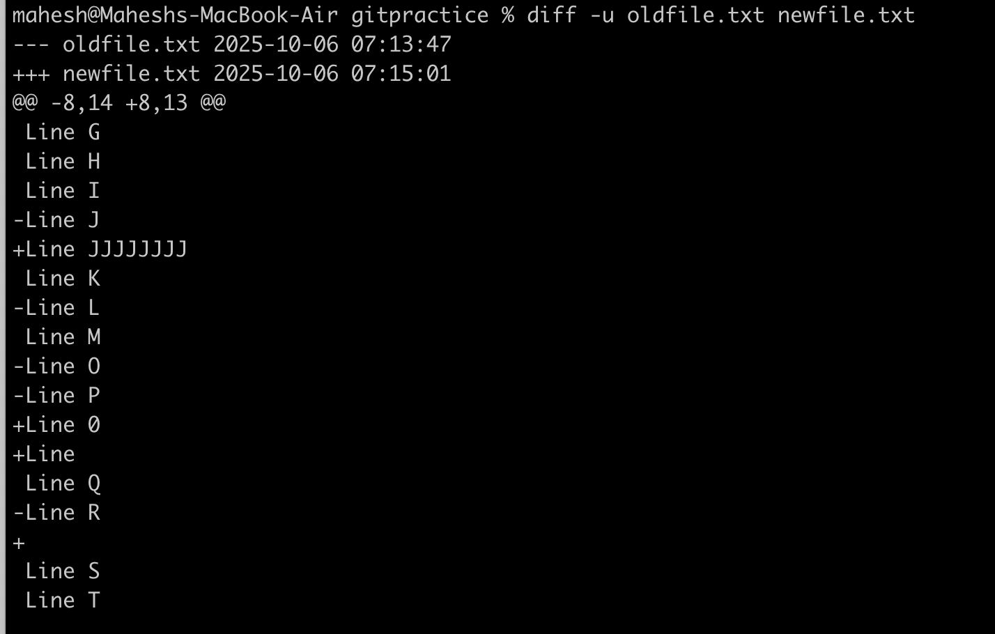 diff→ compares two files (or directories) line by line.-u→ unified format: shows differences along with a few lines of context before and after the changes.Default 3 lines of context (can be changed with