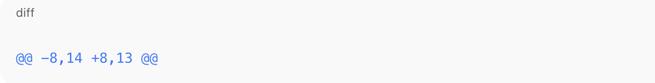 -8,14→ old file: starts at line 8, spans 14 lines+8,13→ new file: starts at line 8, spans 13 lines@@marks the start of a hunk (block of changes).