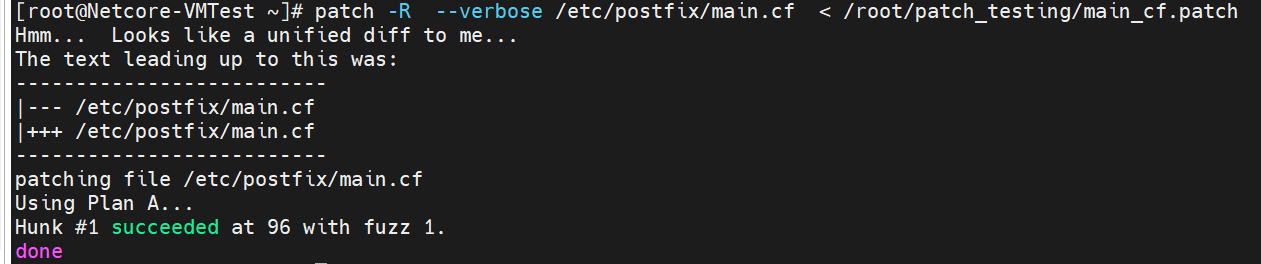 # patch -R --verbose /etc/postfix/main.cf < /root/patch_testing/main_cf.patch