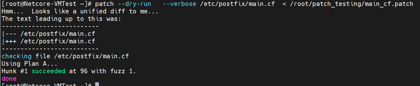 # patch --dry-run --verbose /etc/postfix/main.cf < /root/patch_testing/main_cf.patch