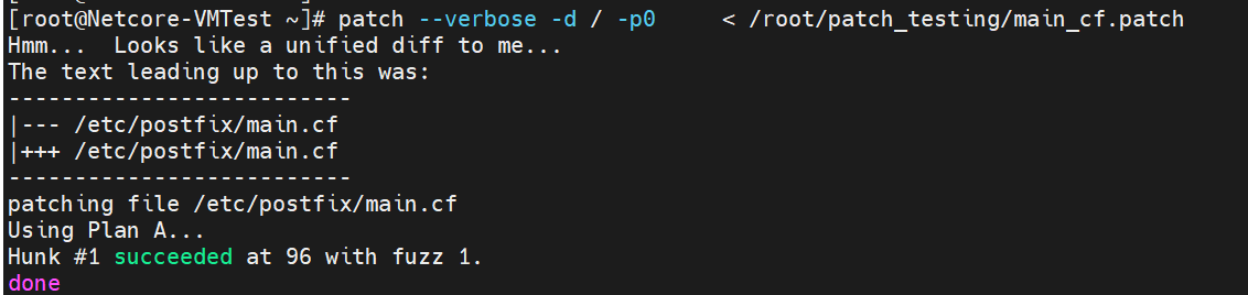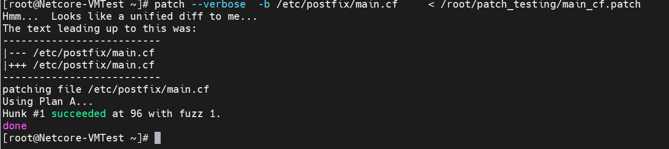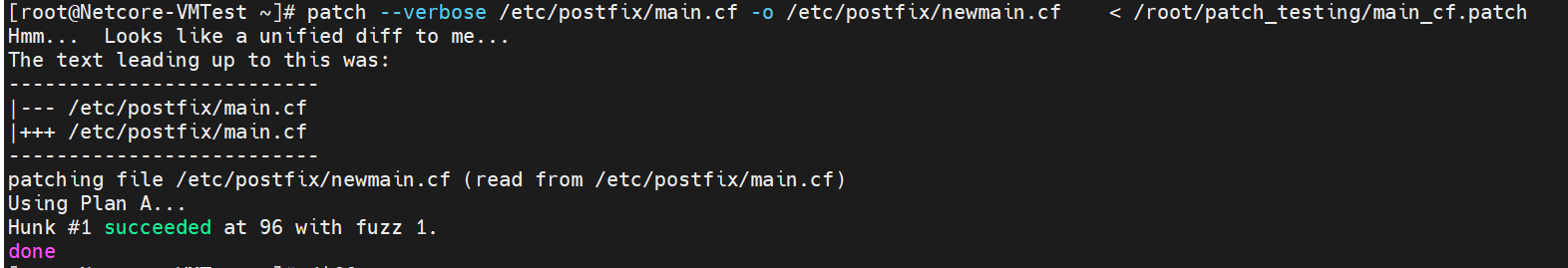 # patch --verbose /etc/postfix/main.cf -o /etc/postfix/newmain.cf < /root/patch_testing/main_cf.patch