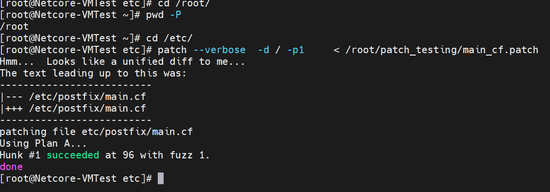 # patch --verbose -d / -p0 < /root/patch_testing/main_cf.patch